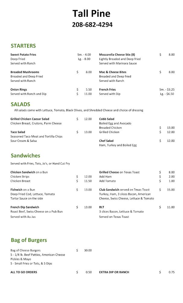 Welcome to Tall Pine Drive-In, your cozy family-friendly diner in the heart of Pinehurst, Idaho. Famous for our classic American comfort food, we serve mouthwatering burgers and indulgent shakes, complemented by daily specials that keep our menu fresh and exciting. Our inviting rustic charm and warm atmosphere make us a favorite among locals and visitors alike. Though we’ve bid farewell to our iconic namesake tree, the spirit of The Tall Pine continues to thrive. Join us for breakfast, lunch, or dinner, and experience why we're the perfect spot for a satisfying meal. Come dine with us today!
